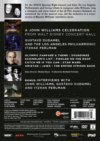 5座奧斯卡獎、21座葛萊美獎加身,影壇配樂巨匠音樂盛宴!收錄《星際大戰》、《神鬼交鋒》、《屋頂上的提琴手》、《辛德勒名單》等經典作品!迪士尼音樂廳首張影音作品,搶先聆聽音樂廳最美的聲音。本場演出刻意安排電影大師約翰威廉斯的配樂作為主題,邀請樂壇當紅指揮杜達美、小提琴大師帕爾曼以及洛杉磯愛樂管弦樂團同台演出,杜達美深具張力的詮釋,與帕爾曼優美的琴音,彼此輝映出影壇上熠熠星光的不朽傳奇