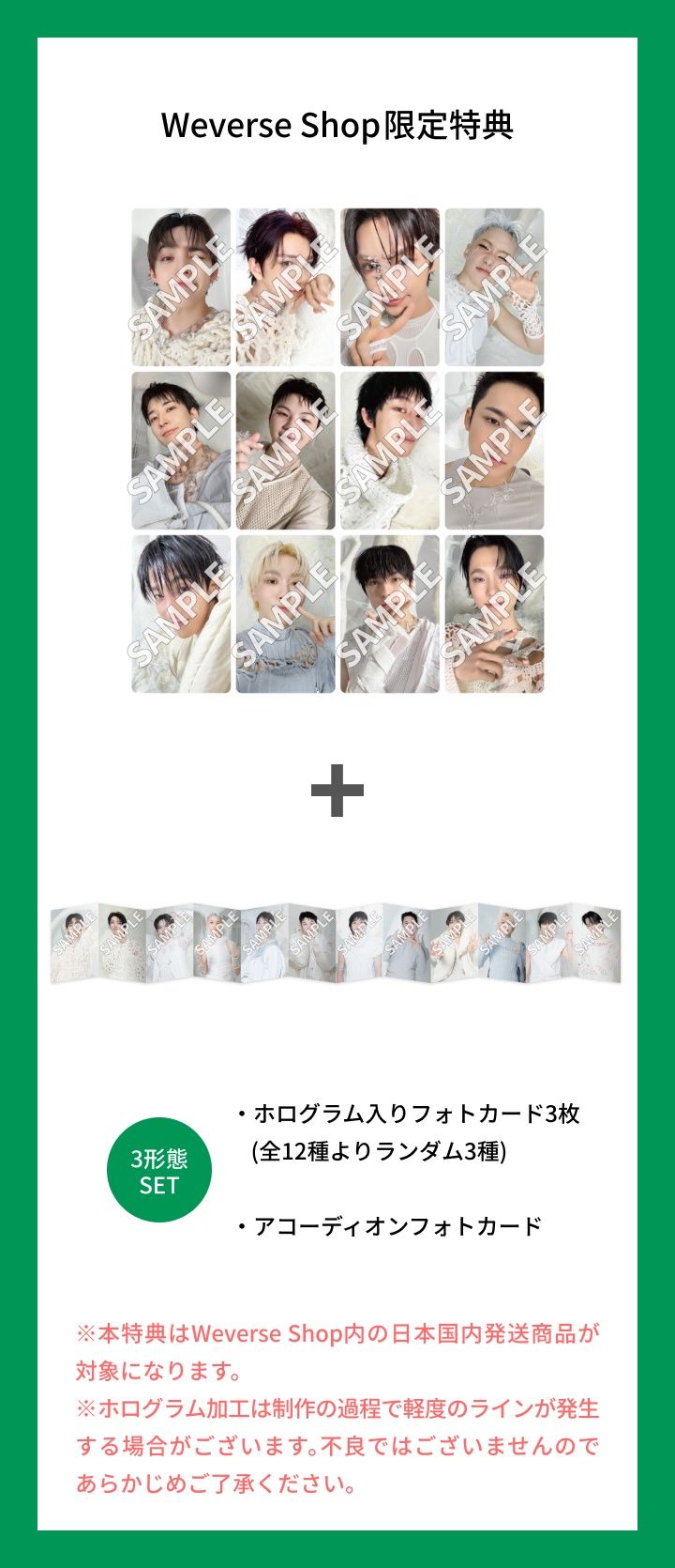 訂購WEVERSE日本官網/三版合購版送Weverse Shop限定特典「閃卡隨機3張(12款隨機3)+拉頁照片卡」