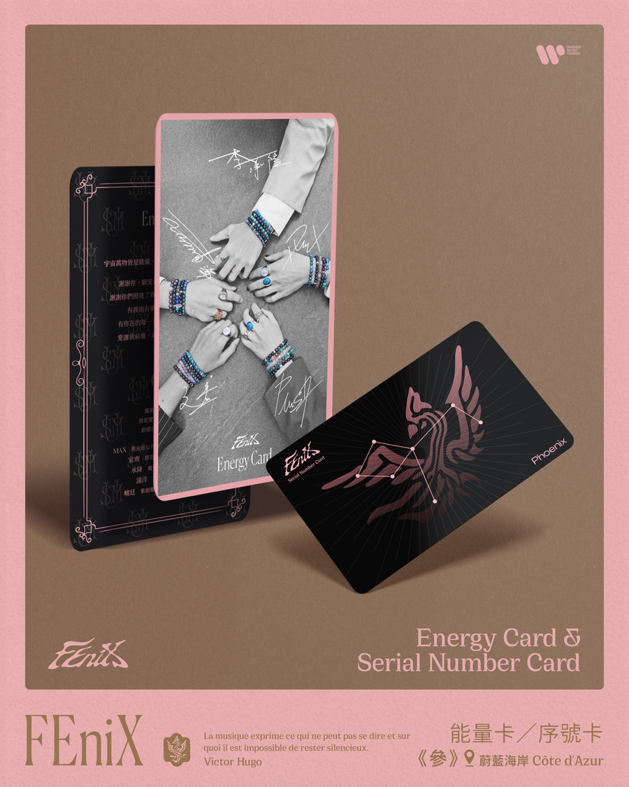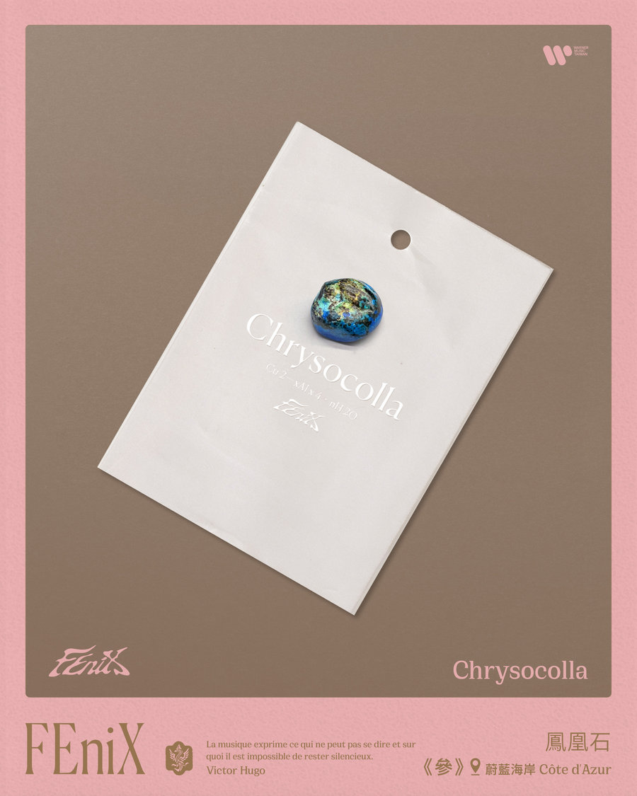 這次FEnix在專輯造型上用了大量的水晶串珠飾品,搭配南法精緻的地中海風格,非常閃亮吸睛。因此專輯附贈了一顆"鳳凰石礦石 (鳳凰石恰巧和團名一樣),希望傳遞給粉絲滿滿的好能量。