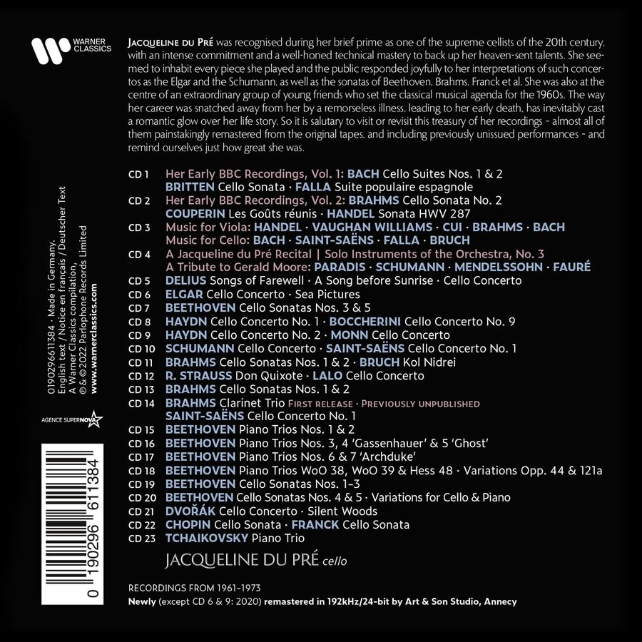 此套裝涵蓋杜普蕾約12年間、在EMI Classics時期所留下的錄音作品,此次幾乎全部使用原始母帶重新以最新192Hz/24bit技術數位處理(除了2張與指揮家巴畢羅里合作的專輯,是使用2020年以HD規格數位處理過的版本作為本套裝母帶)。其中最珍貴的是收錄過去從未發行過的錄音《布拉姆斯:A小調單簧管三重奏,作品114》,此版本是1968年於倫敦艾比路錄音室錄製完成,合作的音樂家為:單簧管演奏家貝耶,以及鋼琴家巴倫波因。另外還有經由法國Art & Son Studio新重製與編輯的《理查‧史特勞斯:唐璜》,以還原與具有更好的聲音呈現。