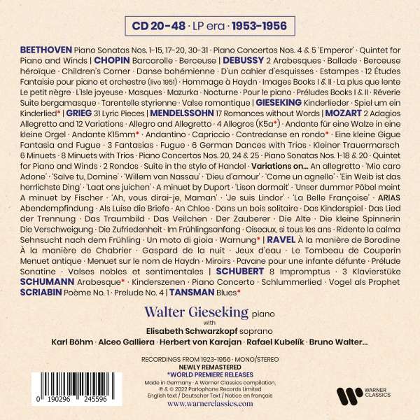 同年的紐約時報讚譽這位德國鋼琴家:「在相對較小的音階變動中,實現了不同反響的豐富和精細效果。」並指出「他的詮釋充滿詩意和想像力,能感受到他音樂想表達的那種親密感,以及他對於要傳達出的聲音的精妙調整。」而季雪金的技巧、想像力與穩健的觸鍵,讓他在德布西與拉威爾的鋼琴獨奏作品中,獲得了特殊而不朽的地位,並將這些作品錄製下來。而莫札特的鋼琴獨奏作品全集又是這套裝專輯中的另一大亮點。