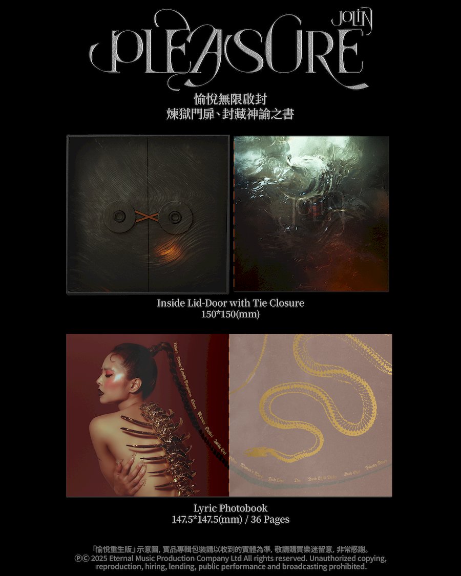 《Pleasure》從人性七罪的深淵,揭露意識與潛意識的慾望源頭,同時喚醒生而為人的同理及悲憫,以誠實覺察為契機,獲得掌舵命運之輪的內在力量。而愉悅,正是命運女神最終遞出的獎賞——它來自慾望,包裹著痛苦、罪惡、焦灼、脆弱,與更多未知且複雜的人性,如緩效多巴胺般昇華,讓人願意理解自己曾極力迴避的本能需求,能包容沉溺,也足夠自愛,JOLIN 渴望將這場穿越慾望、重獲救贖的愉悅旅程,全然敞開,與你分享。