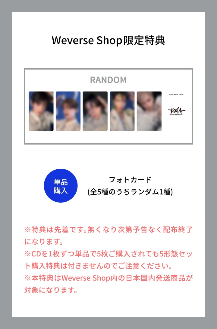 訂購WEVERSE日本官網/隨機版送TOMORROW X TOGETHER Weverse Shop限定特典「小卡隨機1張(5款隨機1)」