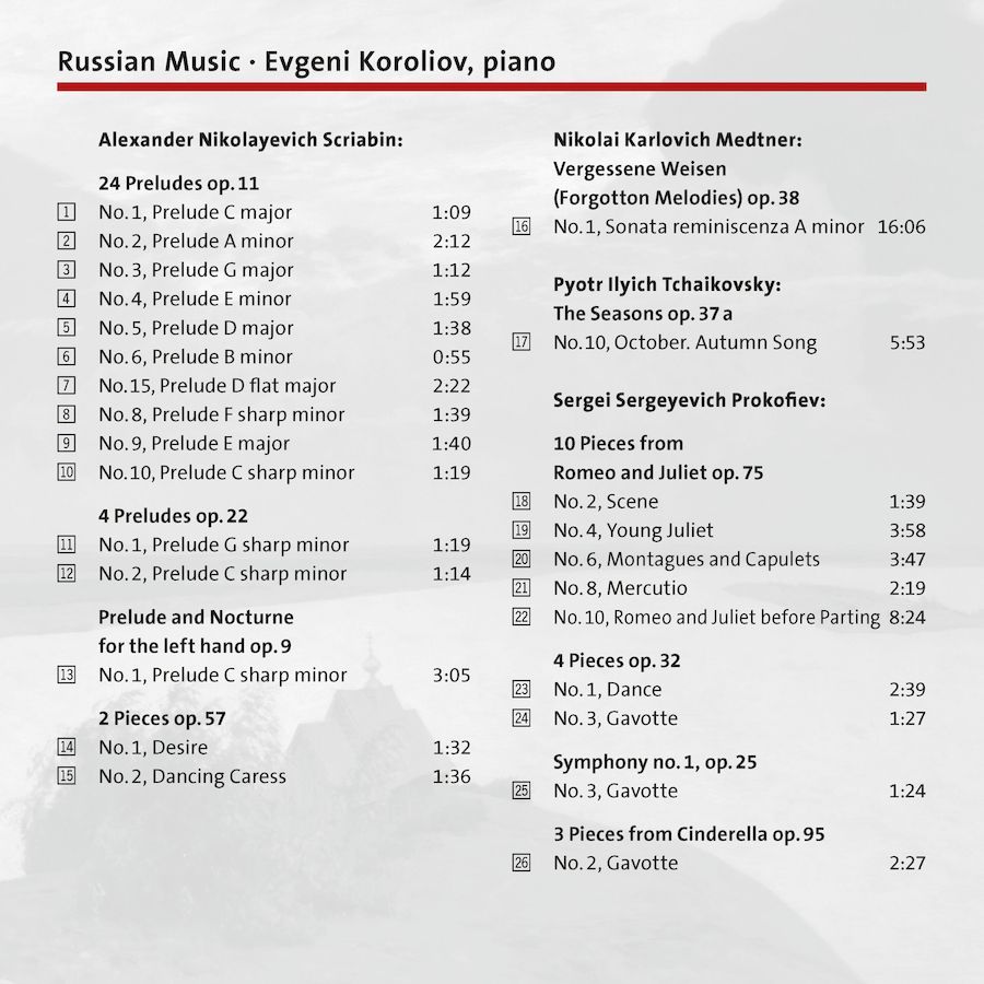 鋼琴家柯洛里奧弗(Evgeni Koroliov)精選四位俄國作曲巨匠:梅特納、普羅高菲夫、史克里亞賓與柴可夫斯基的經典鋼琴作品,以細膩的情感精彩詮釋,展現出俄羅斯音樂獨有的深邃情感,其中收錄的柴可夫斯基《十月》出自1992年錄音,帶出戰爭與革命背景下的音樂記憶。33年後,柯洛里奧弗開啟一場穿越時空的音樂旅程,新專輯呈現對美好過去與更加優美世界的深切渴望,這是他在 TACET發行的第26張專輯,沉靜而具穿透力,是不可錯過的俄派鋼琴珍藏。