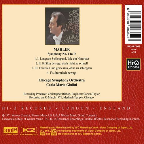 本片馬勒第一號交響曲是他1971年的錄音。可說是他與芝團最具有代表性的錄音,那是結構、聲部 平衡、熱情與客觀平衡的典範。芝加哥交響樂團的首席小號手就說朱里尼之所以能帶領樂團傳達出這麼深刻的音樂,那是因為他整個人的姿態、從手到手臂乃至他臉上的表情、身體的律動都在傳達著音樂給團員。這張XRCD專輯見證了二十世紀交響音樂史上最重要的一份合作里程碑。
