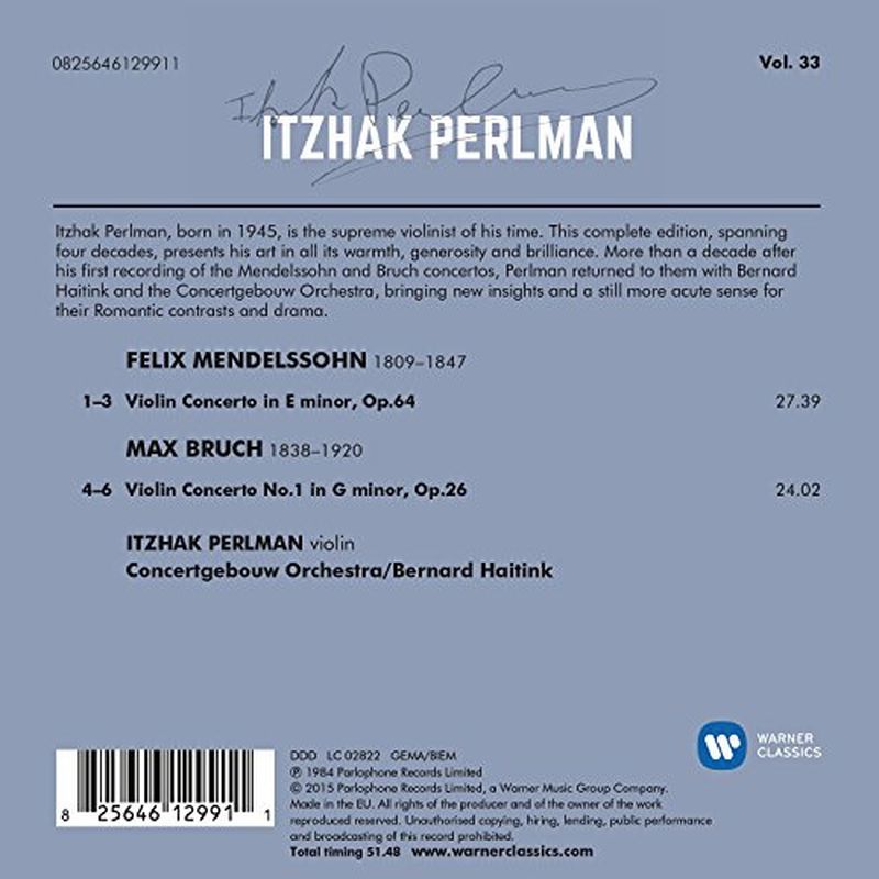 帕爾曼曾兩度留下孟德爾頌+布魯赫第一號小提琴協奏曲錄音,這張專輯是1984年發行,由海汀克指揮阿姆斯特丹大會堂管弦樂團演出的版本。新的錄音,帕爾曼展現了新的觀點與洞見,以更纖細敏銳的感受力,呈現這兩首浪漫派作品中的情感對比與戲劇張力。