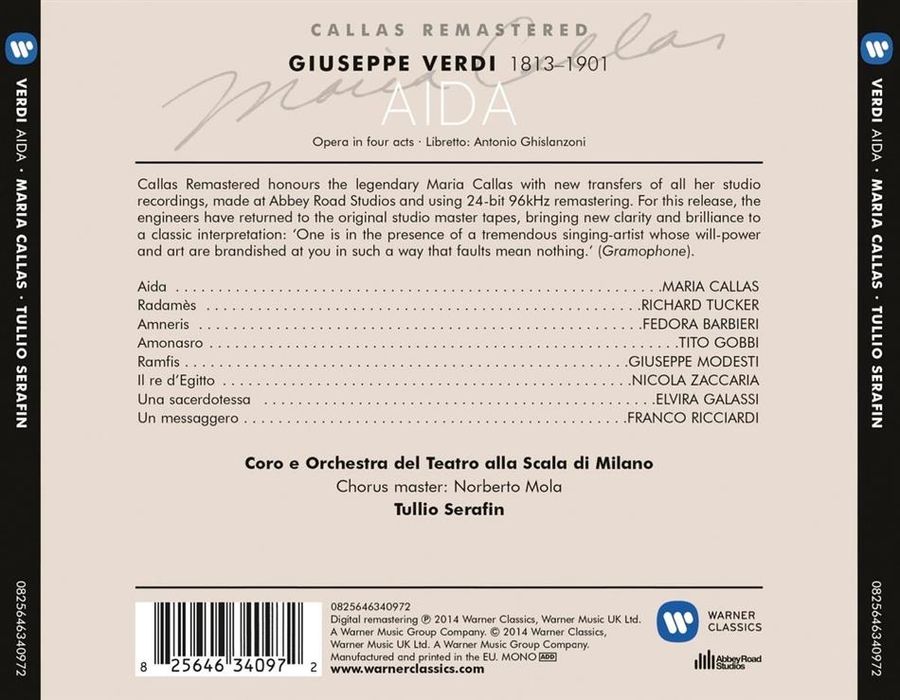 卡拉絲一生總共在舞台上唱過三十次阿伊達,最後一次登台是1953年8月於維洛納圓形競技場,而這套全曲錄音是1955年8月於史卡拉歌劇院錄製。發行後有人批評她為了戲劇效果而犧牲了音樂美感,但是歷經時間考驗,如今卡拉絲的版本成為許多評論與樂迷的極致選擇。尤其阿伊達這角色除了兩首經典詠嘆調之外,多半透過重唱曲來闡述人物的內心刻劃,於是飾演將軍的塔克、飾演情敵的芭碧耶莉、及飾演父親的戈比,與卡拉絲處處迸發精采的對唱火花,而賽拉芬的統御也營造出威爾第大歌劇的宏偉氣度。
