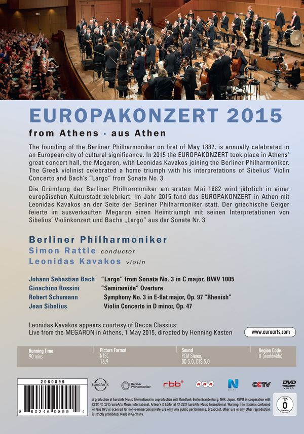 柏林愛樂為慶祝樂團成立,慣例在每年的5月1日會挑選歐洲的一個城市來舉辦創團慶祝音樂會,也就是著名的「柏林愛樂歐洲音樂會」。2015年他們挑選希臘的雅典來舉辦該音樂會,並邀請希臘小提琴家卡瓦科斯一同加入演出,卡瓦科斯選擇〈西貝流士:小提琴協奏曲〉以及〈巴哈:第三號小提琴奏鳴曲─慢板〉在音樂會上演出。指揮家拉圖帶領柏林愛樂則是選擇演出羅西尼、舒曼的作品,帶領樂迷們穿越歐洲大陸來一趟音樂之旅。