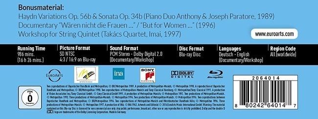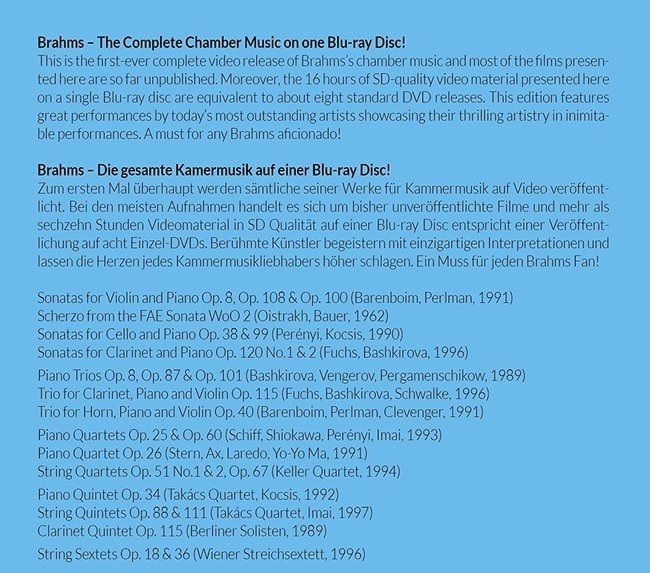 這是有史以來,布拉姆斯室內樂完整被收錄在一張藍光光碟上(約八張一般DVD),影片採用標準DVD格式,聲音則是未壓縮過的PCM數位格式與杜比數位雙聲道音效(紀錄片與詮釋討論部分)。影片拍攝年代介於1962年到1997年之間,不但時間總長超過十五個小時,其中有多部影片都是世界首度發行。除了完整的室內樂曲,也加贈收錄兩首雙鋼琴作品、今井信子與塔卡契弦樂四重奏溝通弦樂五重奏詮釋方式的影片、以及紀錄片《But for women》。