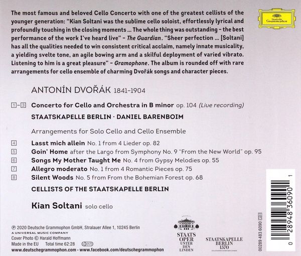 在巴倫波英與柏林國立管弦樂團的協奏下,索爾塔尼以德弗札克這一首號稱是史來最受喜愛的大提琴協奏曲展現他演出大型作品的實力。這首協奏曲是德弗札克最後一首協奏曲,當時德弗札克正擔任美國紐約的國家音樂學院院長。作品完成後,極度思鄉的德弗札克等不及樂曲首演,立刻收拾行囊回到故鄉。獨奏的大提琴從頭至尾如一個歌者,娓娓唱出緊湊而情感洋溢的三個樂章。它的旋律並不華麗,但是樸素中要帶有黏膩而又豐富的情感。