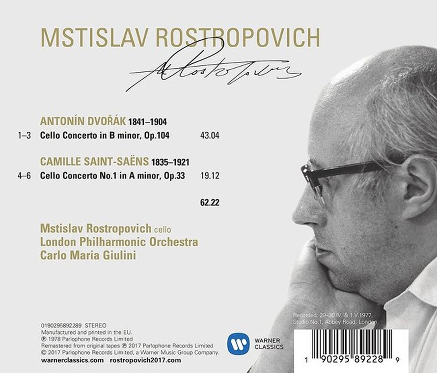 這張唱片錄製於1977年。德弗札克大提琴協奏曲的錄音相當多,但是沒有人能和羅斯托波維奇一樣,演奏出音樂中抒情的溫暖感覺。他對於作品的理解十分深刻,朱里尼的協奏則是抒情優美,呈現出與羅斯托波維奇其他同曲目錄音完全不一樣的風情。