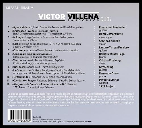 This disc devoted to Duos is the fruit of more than ten years of meetings and artistic collaborations that have little to little enriched my repertoire and always widened my musical horizons. Since my arrival in France there are twenty-one years, I devoted myself just as much to Tango, folk music, as classical or contemporary creation, refusing the labels and following above all my instinct and the friendly links forged with the artists who shared, to musical exploration, these works and these years with me.