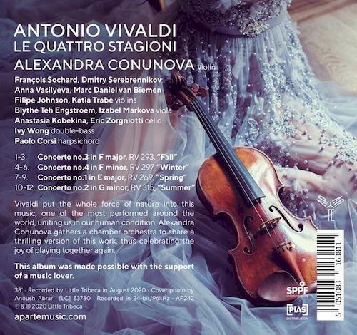 亞莉珊卓.科奴諾娃(Alexandra Conunova)召集一個室內管弦樂團一起詮釋一個令人興奮的韋瓦第大師級作品. 一件在世界各地最常被演奏, 讚美大自然的力量的作品, 是這高度敏感和富有想像力的錄音專輯強調的一點.